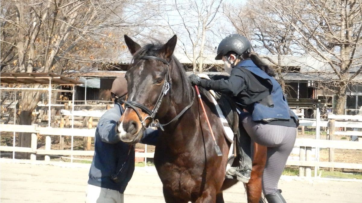 馬装から騎乗、手入れまでアップリケ牧場での流れも体験していただきます。基本的には少人数部班の丸馬場で牧場の雰囲気や馬に慣れていただくようにしていますが、3種の歩様を全て自身でコントロールできる(全国乗馬俱楽部振興協会3級ライセンス相当)の方は、角馬場での部班レッスンにご案内する場合もあります。