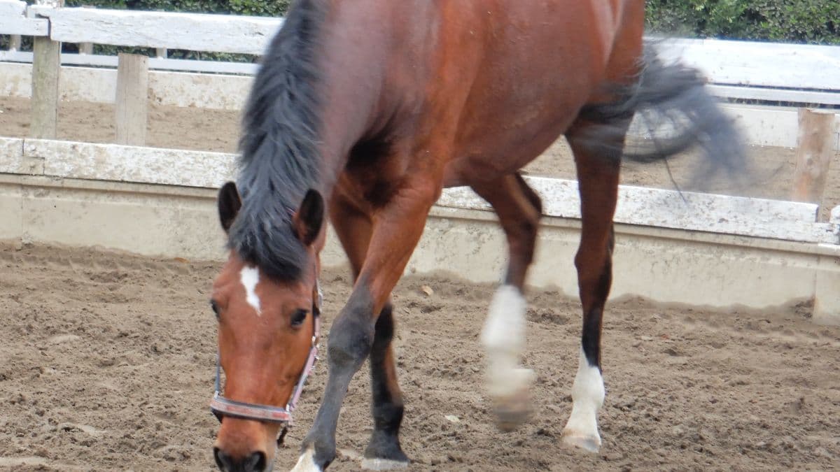 年齢はピースと同い年ですが、2020年まで競走馬として現役で走っていてその後も競馬学校で働いていたので、乗用馬としての調教は牧場に来てから。そのせいか年齢の割に幼いところが多く、大きな身体の赤ちゃんっぷりに密かに女性ファンの多い馬です。