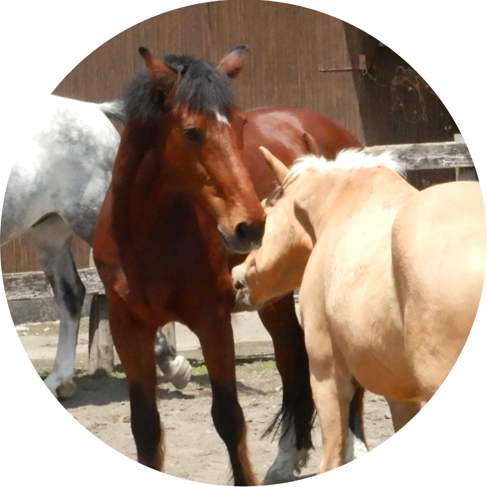 なんとなく赤ちゃんぽいあどけなさが抜けない女のコ。放牧場でダメなことはダメとしっかり叱ってくれるふじこお姉ちゃんの事が大好きです。馬場馬術の競技馬を目指してトレーニングに励んでいます。