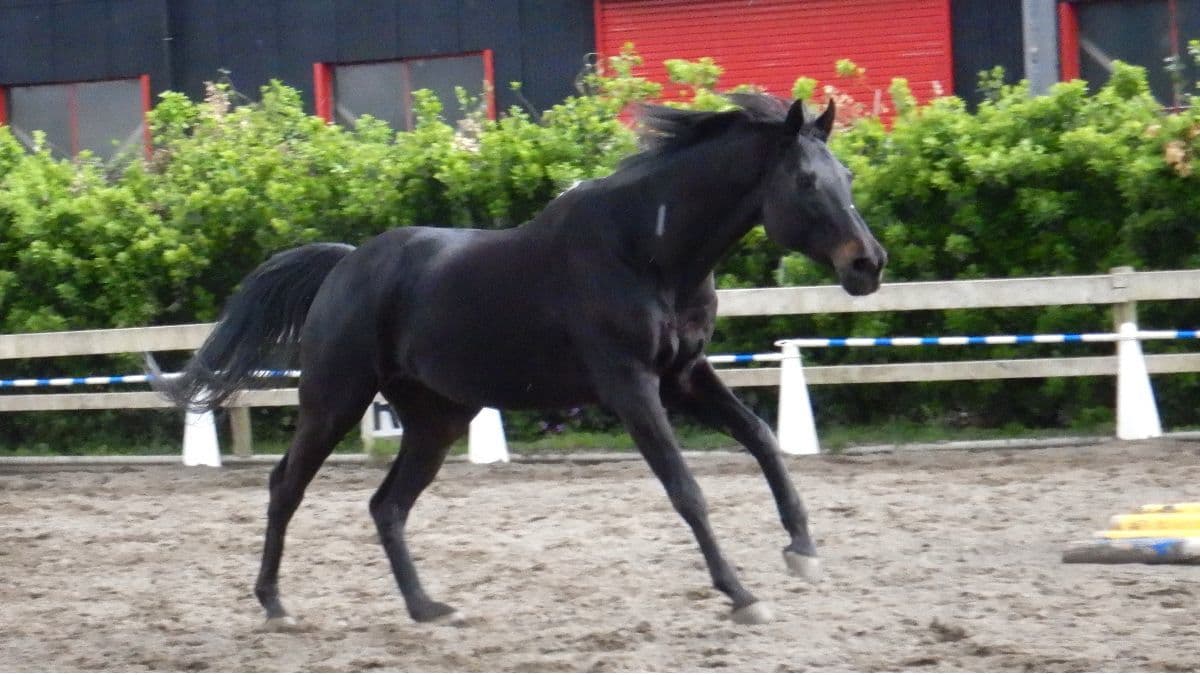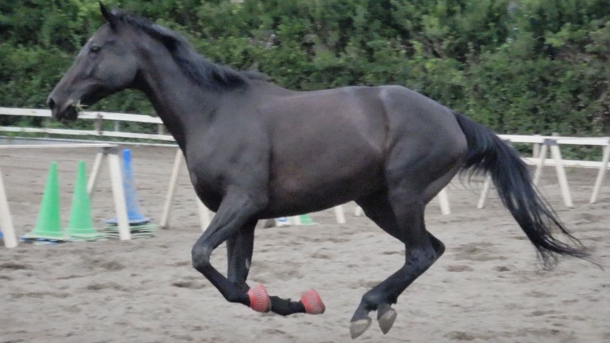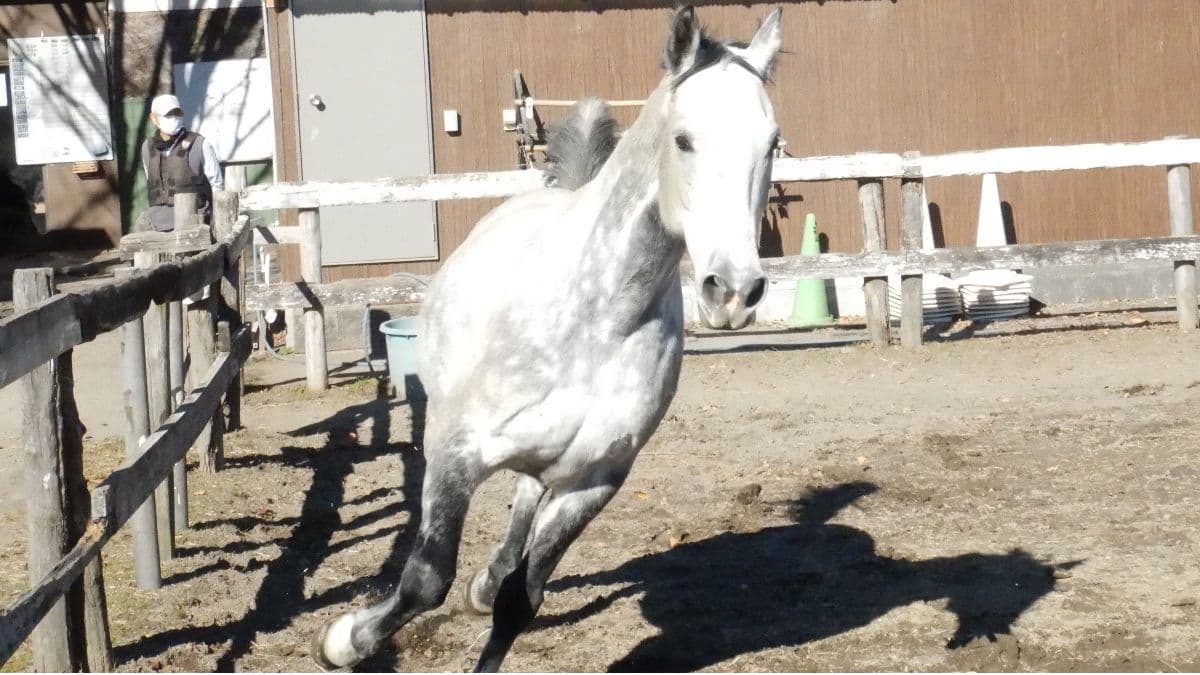 牧場に来たときは全身ほぼ濃いグレーでしたが、だいぶ葦毛らしい色になってきました。サラブレッドとは違う中間種ならではの柔軟で大きな動きの背中は抜群の乗り心地!とっても練習になる馬です。